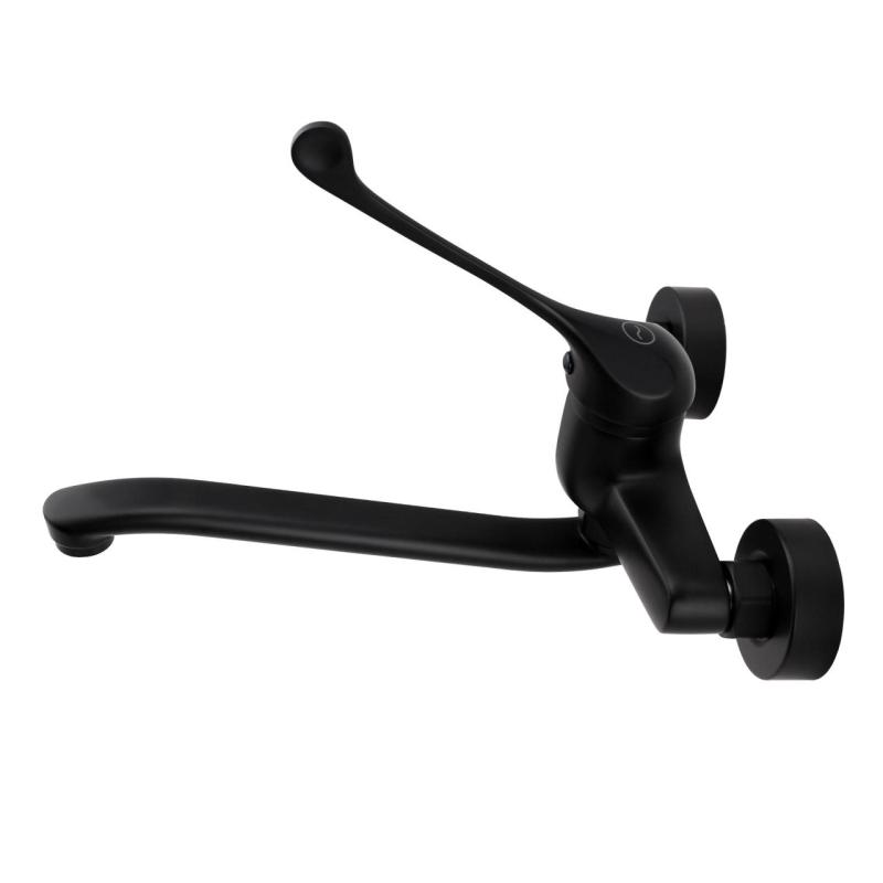 A torneira de cozinha de paredeAquanello Medic não só oferece um visual elegante graças ao seu acabamento em preto, mas também vantagens práticas, como um bico giratório e uma alavanca extra longa para facilitar o uso. O material de latão de alta qualidade e os discos cerâmicos garantem durabilidade e um funcionamento suave.